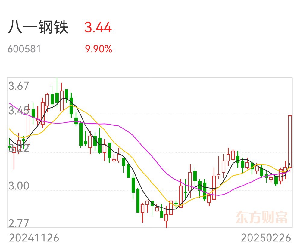 2月26日上午,钢铁股震荡拉升,八一钢铁涨停,本钢板材、抚顺特钢、三钢闽光、中南股份、新钢股份、华菱钢铁等跟涨。