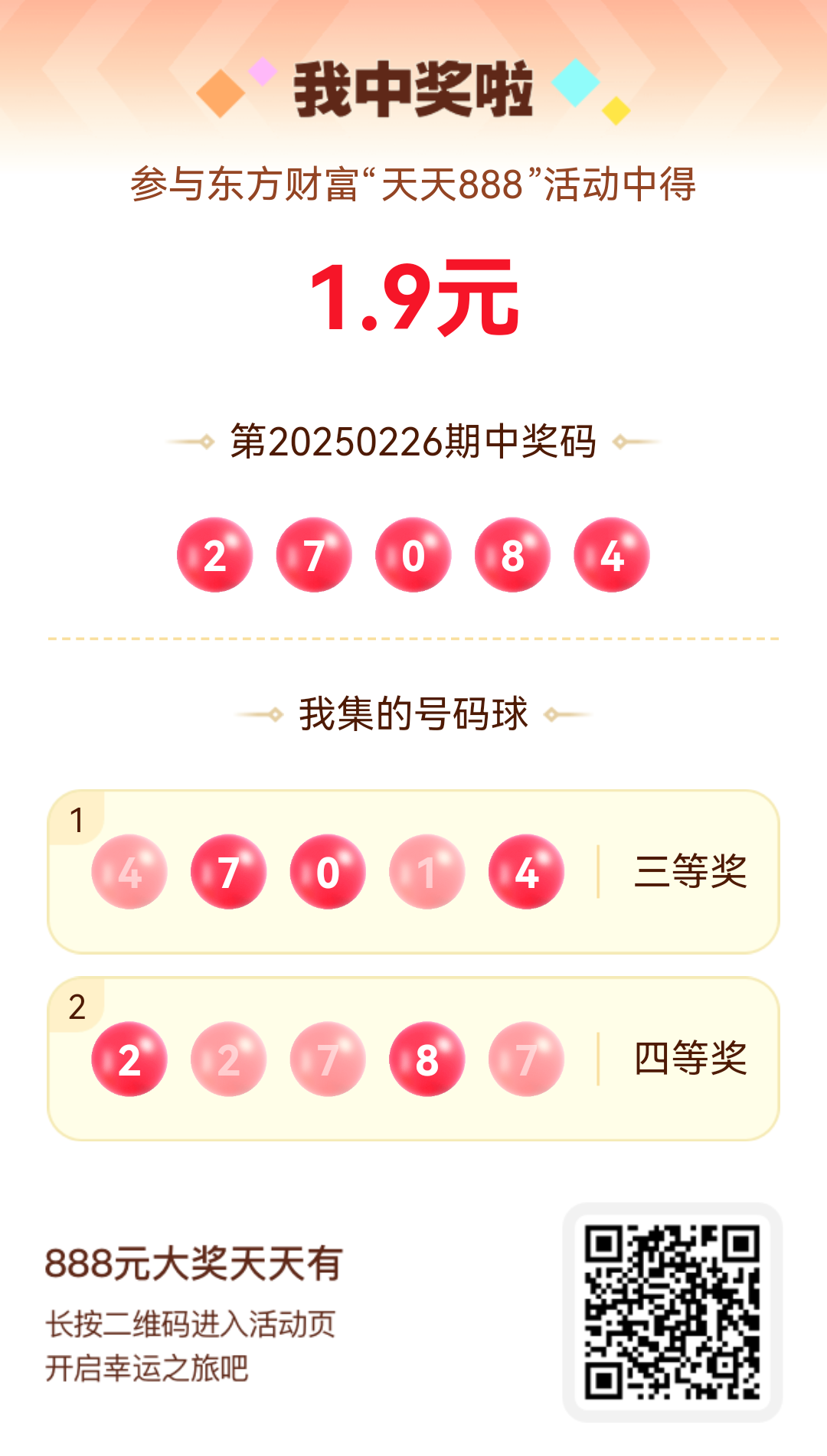 第20250226期天天888活动共1557人中奖,名单如下,请中奖用户在今日15:10前前往活动页面点击【立即领奖】按钮领奖,逾期奖励失效。