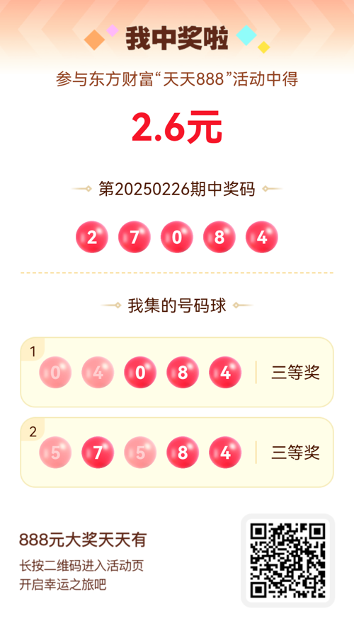 第20250226期天天888活动共1557人中奖,名单如下,请中奖用户在今日15:10前前往活动页面点击【立即领奖】按钮领奖,逾期奖励失效。