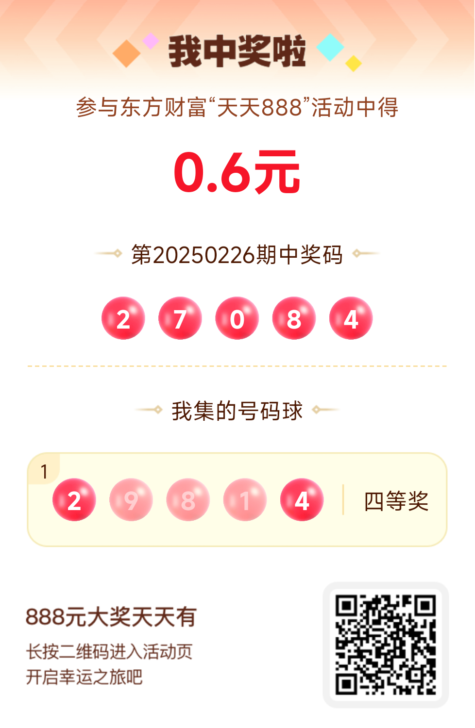 第20250226期天天888活动共1557人中奖,名单如下,请中奖用户在今日15:10前前往活动页面点击【立即领奖】按钮领奖,逾期奖励失效。