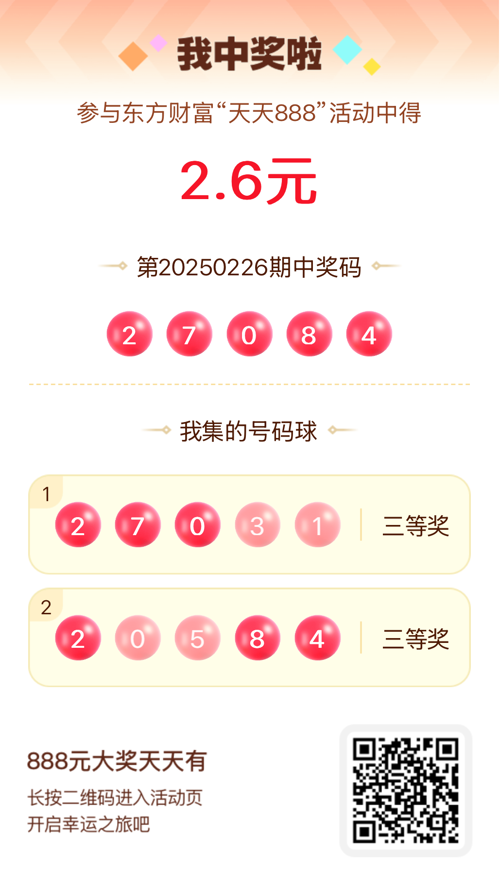 好运来敲门!我在东方财富“天天888”抽奖活动中抽中2.60元红包!快来参与,下一个幸运星可能就是你!