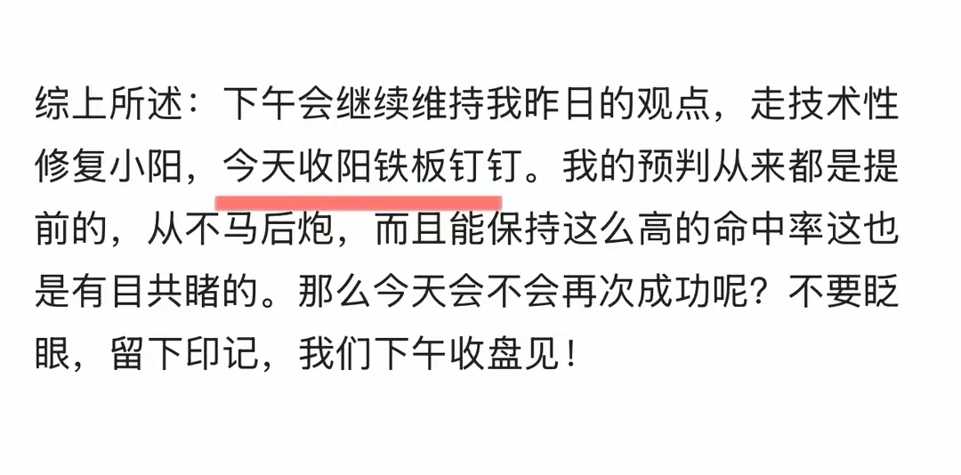今天的走势比我预期的还要好,我昨天就说了今天必然技术性修复,收小阳。今天太给面子了还收了个中阳,我把昨天预判今天走势的截图奉上!