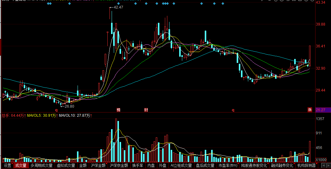 中金公司601995:公司是中金银河重组传闻概念股,公司里都是金融领域的专业人才,团队素质高、经验丰富,能给客户提供特别专业、周到的金融服务,有了这些人,公司发展就有了坚实的智力支持。周三A 股涨停,股价报收 36.43 元,港股涨 19.09%,表现非常亮眼。券商板块在周三的尾盘也是有着明显的抢筹迹象,中金公司从分时走势图来看,拉伸的非常的果断,成交量也是在明显的放量,说明市场中的做多意愿较强,券商有望延续周三强势的表现,前排中金公司,依然还是值得期待。从技术面来看,中期趋势还是在圆弧底的上升通道之中,下方多条均线也是开始拐头向上,行情还没有结束,还是有望继续惯性冲高,值得期待。