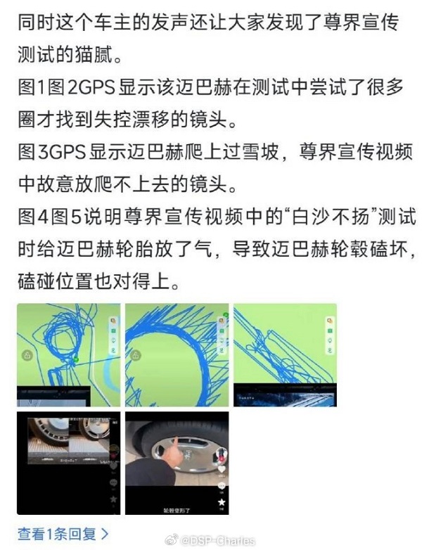 随着事件的发酵,有网友从上述信息中又提出新猜测:例如GPS显示迈巴赫在测试中爬上了雪坡,但宣传视频中选择了爬不上去的镜头;宣传视频中“白沙不扬”镜头疑似迈巴赫轮胎充气不足,导致扬沙并磕坏轮毂等。
