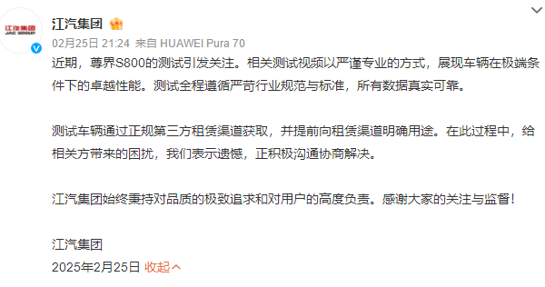 一时间尊界再被卷入舆论漩涡。针对本次“租车测试”风波,江汽集团2月25日发表声明称,相关测试车辆通过正规第三方租赁渠道获取,并提前向租赁渠道明确用途。企业对相关方带来的困扰表示遗憾,正积极沟通协商解决。
