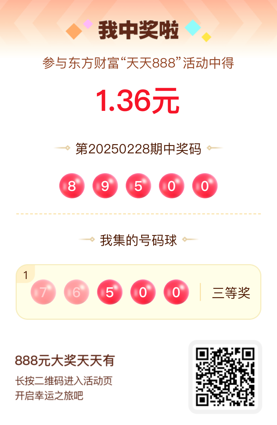 好运来敲门!我在东方财富“天天888”抽奖活动中抽中1.36元红包!快来参与,下一个幸运星可能就是你!