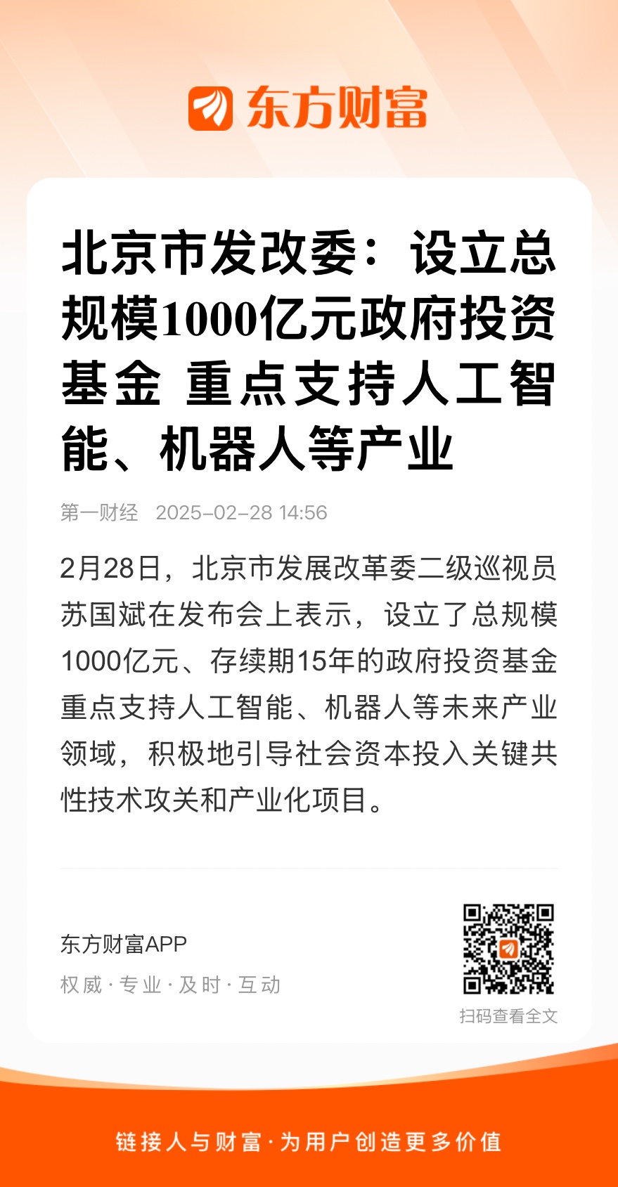 2月28日,北京市发展改革委二级巡视员苏国斌在发布会上表示,设立了总规模1000亿元、存续期15年的政府投资基金重点支持人工智能、机器人等未来产业领域,积极地引导社会资本投入关键共性技术攻关和产业化项目。