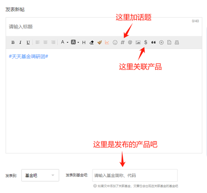 正文中需用菜单栏处的“#”插入话题功能,添加#天天基金调研团#话题;