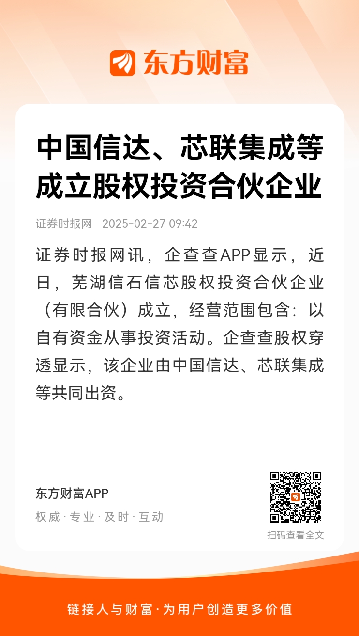 证券时报网讯,企查查APP显示,近日,芜湖信石信芯股权投资合伙企业(有限合伙)成立,经营范围包含:以自有资金从事投资活动。企查查股权穿透显示,该企业由中国信达、芯联集成等共同出资。