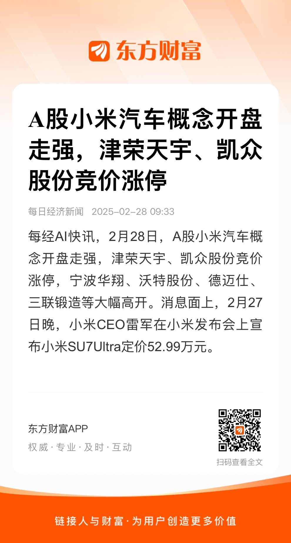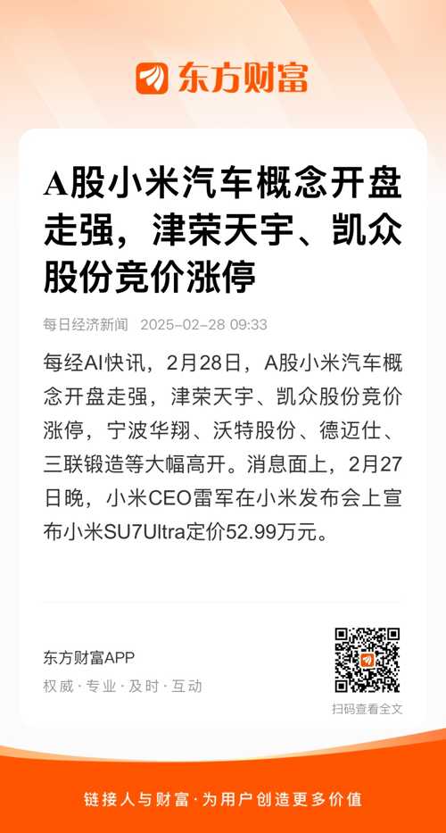 每经AI快讯,2月28日,A股小米汽车概念开盘走强,津荣天宇、凯众股份竞价涨停,宁波华翔、沃特股份、德迈仕、三联锻造等大幅高开。消息面上,2月27日晚,小米CEO雷军在小米发布会上宣布小米SU7Ultra定价52.99万元。
