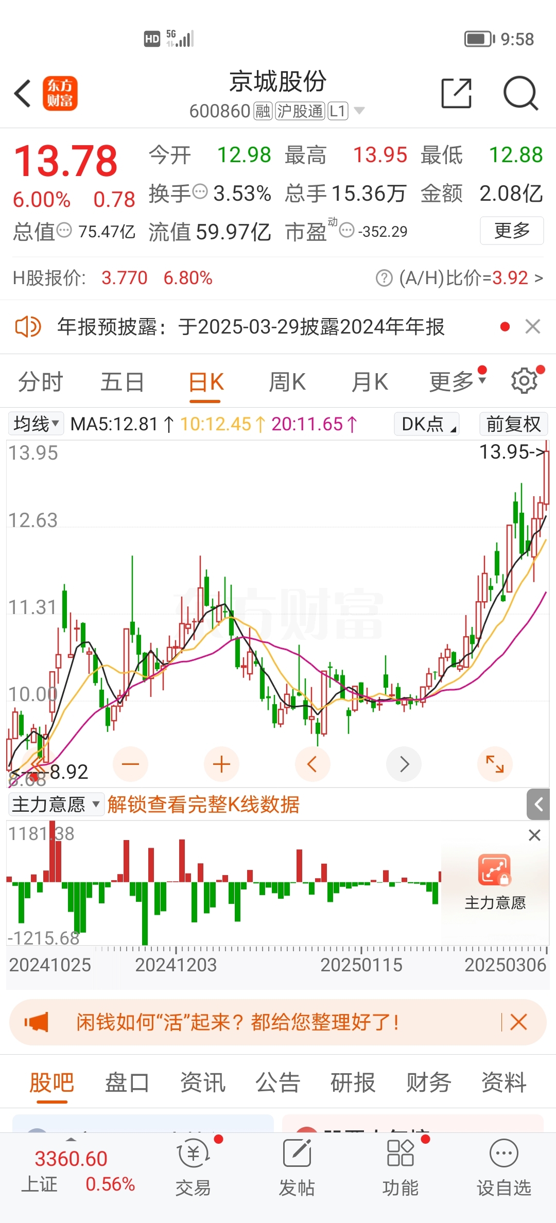 漂亮,上周四在群里面分享的:京城股份,今天继续拉升,跟上了朋友,至少有十个点的盈利了,稳健的朋友可以盈利出局了。