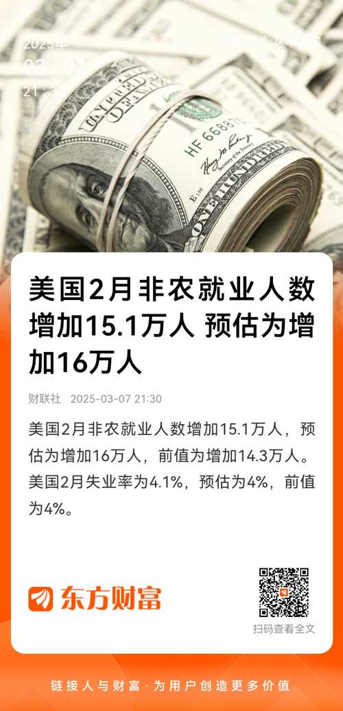 具体数据显示,美国2月份季调后非农就业人口增加15.1万人,低于市场预期的16万人,1月数据从14.3万人下修至12.5万人,去年12月数据从30.7万人修正至32.3万人。