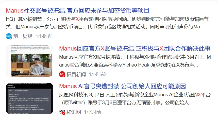 结果美国时间9点,也就是我们的夜间,新闻报道称Manus的X账号被封杀,也就是马斯克家的美国twitter把这个公司的账号封了,有推测是因为这个公司违规炒作。