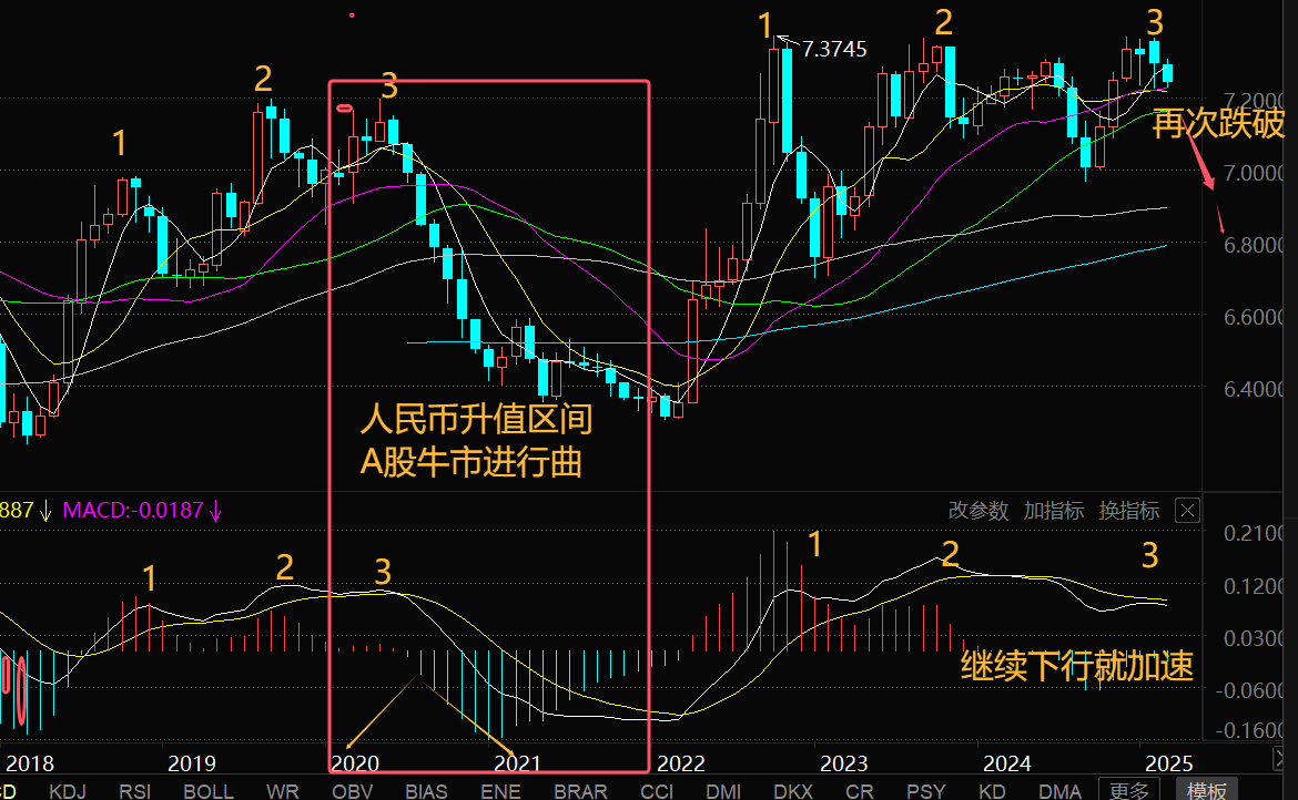 上图人民币月线,未来下行是必然的【下行就是升值】,只是大漂亮国还在抵抗,不过懂王是希望降息的,就看它内部博弈的时间有多久了,但是最终结果一定会按照图表趋势的方向运行。希望是我推理的时间6·-7月!