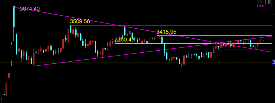 本周10周线下行斜率已经变缓,但是还没有拐头上行,这样的话,未来指数的选择一是再拉一个雷同本周的周阳线,强拉10周线上行。这个概率可以有,再冲击测试靠近一下上方3418附近的压力。二还可以做一个周线回踩20天线或者20周线的动作,再下一周才上行。即使下周强拉到3418附近,也得回落。所以,看似我这样的分析模棱两可,但是,你要知道,大趋势中的细节本就很难把握精准,而且我本就判断,指数会在窄幅箱体波动。