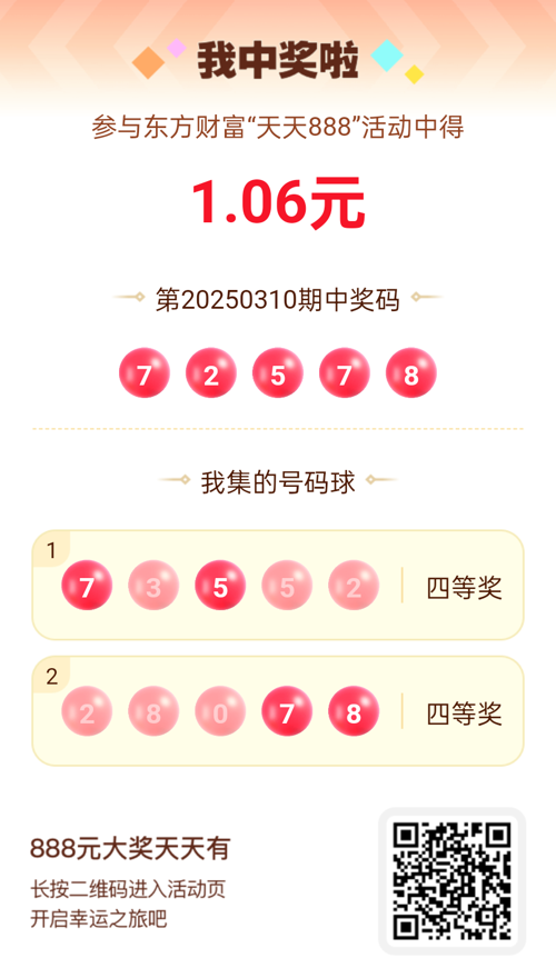 好运来敲门!我在东方财富“天天888”抽奖活动中抽中1.06元红包!快来参与,下一个幸运星可能就是你!