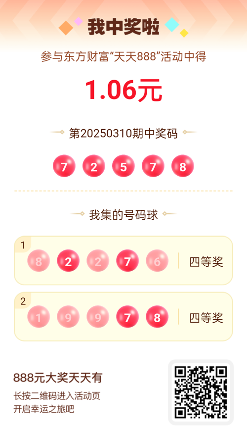 好运来敲门!我在东方财富“天天888”抽奖活动中抽中1.06元红包!快来参与,下一个幸运星可能就是你!