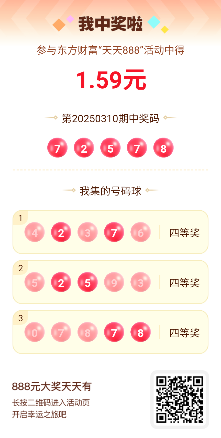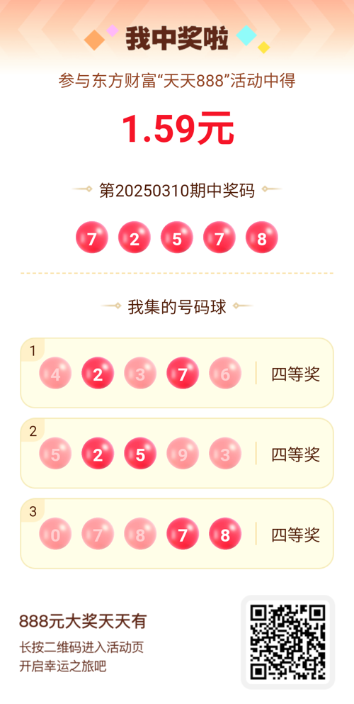 好运来敲门!我在东方财富“天天888”抽奖活动中抽中1.59元红包!快来参与,下一个幸运星可能就是你!