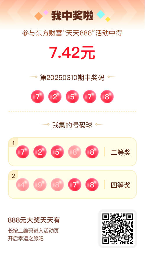 好运来敲门!我在东方财富“天天888”抽奖活动中抽中7.42元红包!快来参与,下一个幸运星可能就是你!