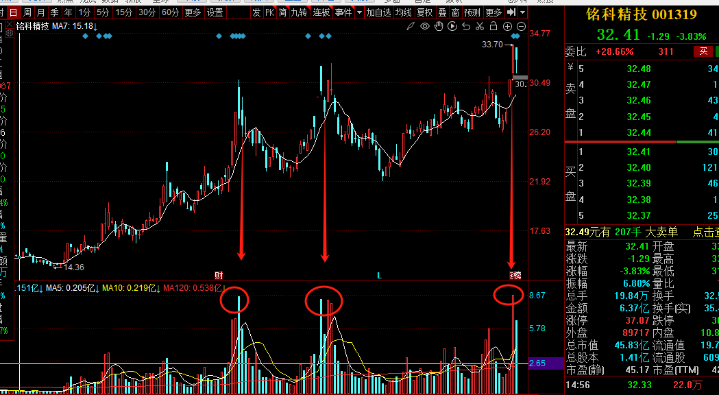 每一个阶段高点都对应了一波巨大的量能,显示了这个票的活跃度,前两波高点放量后都快速的走出了破位七日均线的走势,上周五的两连板在放出巨量后创下了新高,并且昨天走出了缩量调整形态,如果后市能够稳住在均线之上,则有望确认其突破有效,一旦形成这种态势,从技术上和心理上都将对空调形成致命的打击,重新开启上攻之路。
