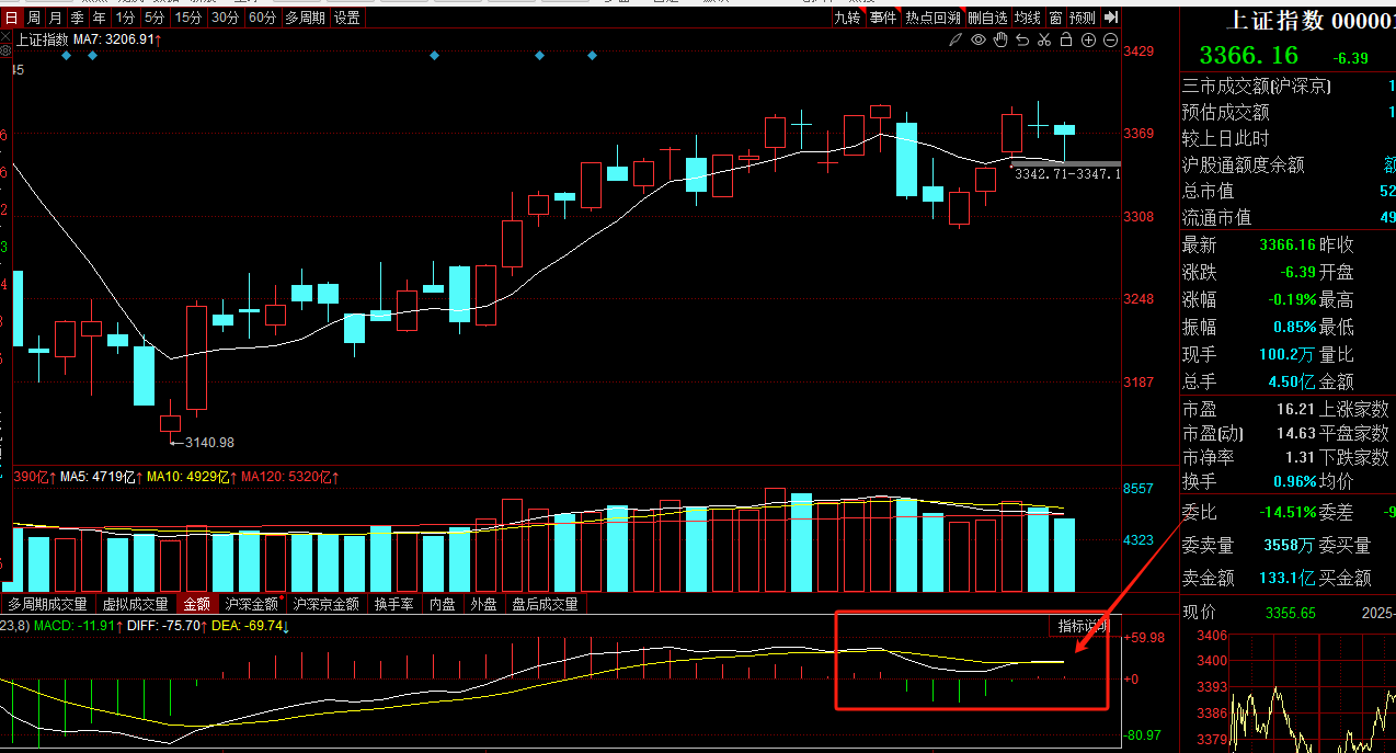 指数继续保持在3350点这一代震荡,昨日两市成交量已经萎缩到了1.5万亿,较前一日减少3126亿。从技术看MACD已经在0轴附近争夺了三个交易日,黄线和白线始终无法完成方向的选择,是金叉还是死叉?我相信这里很快会结束缠绕。昨天恒指在我们收盘后收跌,之前文章分析过港股这波科技牛到了现阶段资金是有兑现需求的,一旦港股的科技板块调整我们很难不跟,这是我们固有的调性,从昨日的成交额排行去看,短线票不少都是放着巨量走调整,这些票既是对短线情绪的负面反馈也是给予到指数极大的压力。