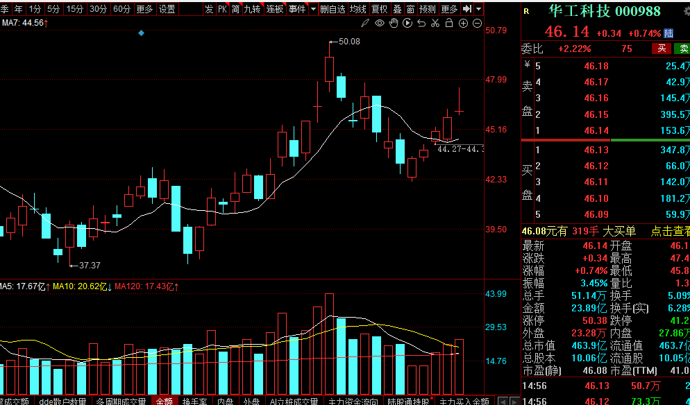 昨天的收线相对不是很友好,今天对会有比较大的考验,如果主力资金实力够强,做多意愿够坚决的话,昨天流出了近1亿的主力,如果今天是走调整路线,则支撑位置在44.56,就算支撑能起到作用也要留意资金的流向。