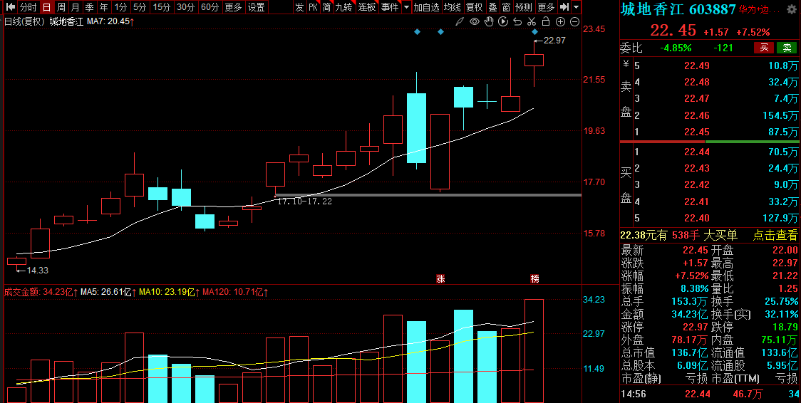 上周五城地香江冲高回落,留下长长的上影线,昨天高开杀跌后再度拉升,实体K线完全吃掉了周五的上影线,这种K线组合在相对底部就是一个看多的组合形态。量能方面,进行了有效的放量,主力资金净流入超过8000万,接下来预计会有洗盘动作,这种洗盘可能是日线级别的,也可能是日内分时级别的,洗盘的逻辑在于主力大举进场留下高位上影线,说明抛压不小,通过洗盘可以洗去意志不坚定的筹码,方便后市的拉升。风险点在于,如果洗盘过于激烈,破位七日均线,则短期上升势头会终止。