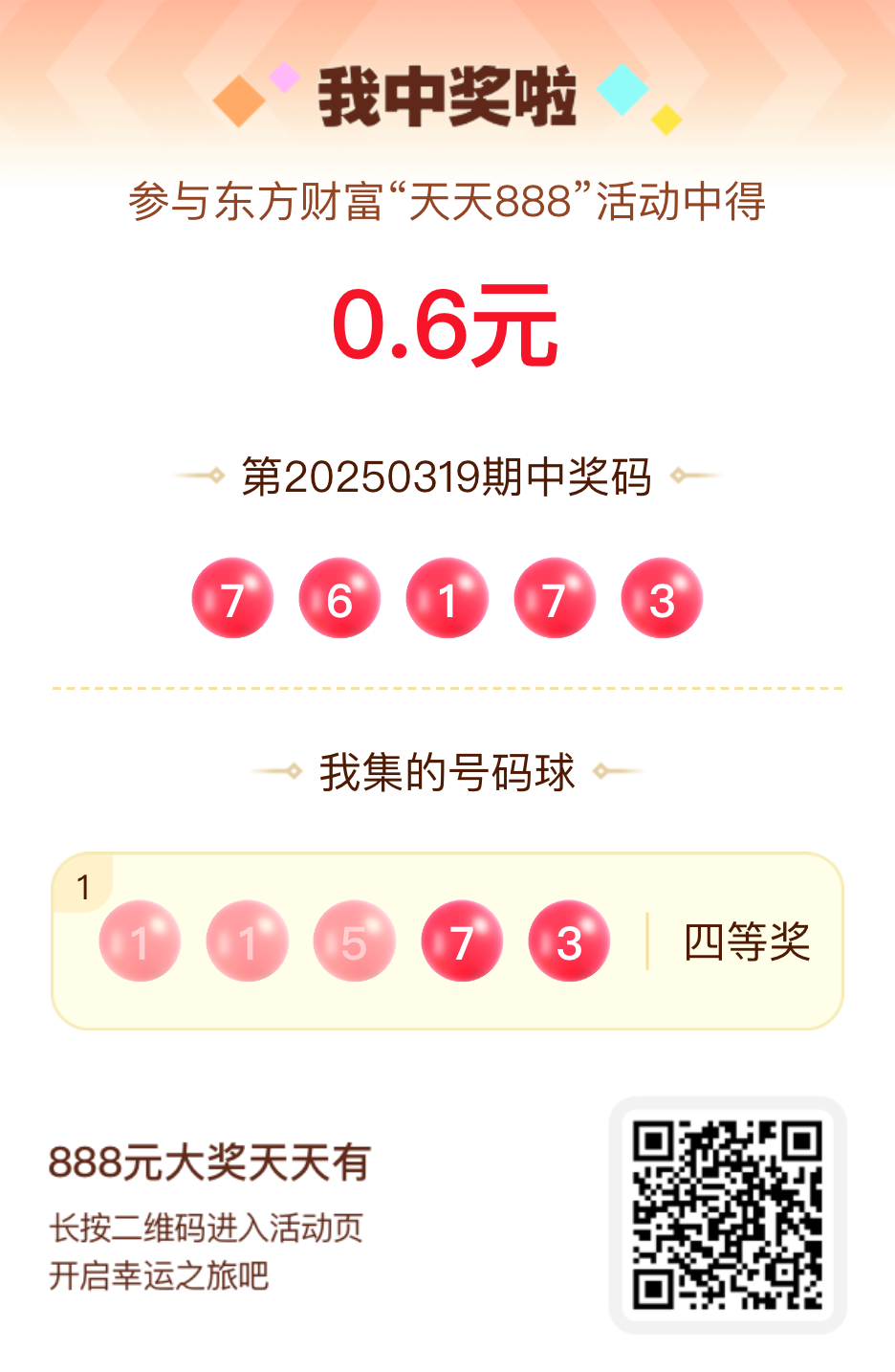 第20250319期天天888活动共1535人中奖,名单如下,请中奖用户在今日15:10前前往活动页面点击【立即领奖】按钮领奖,逾期奖励失效。