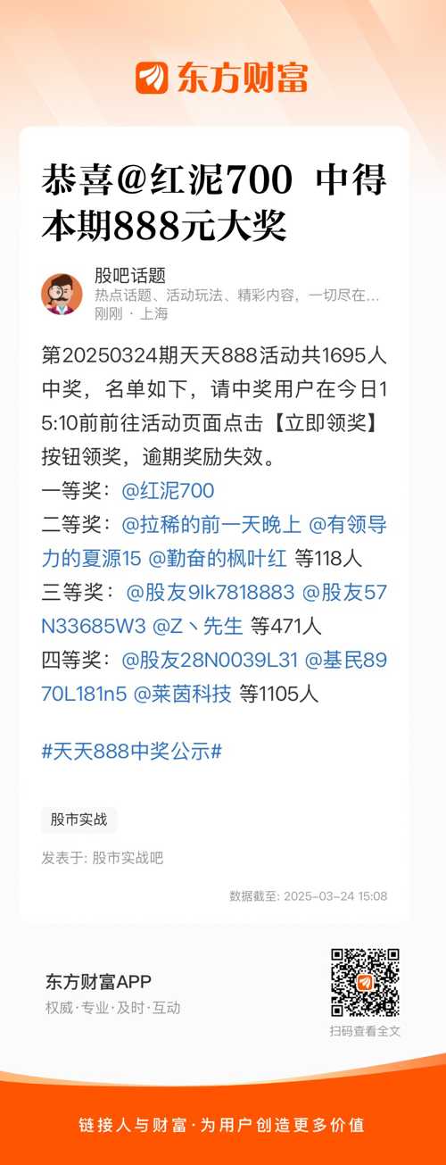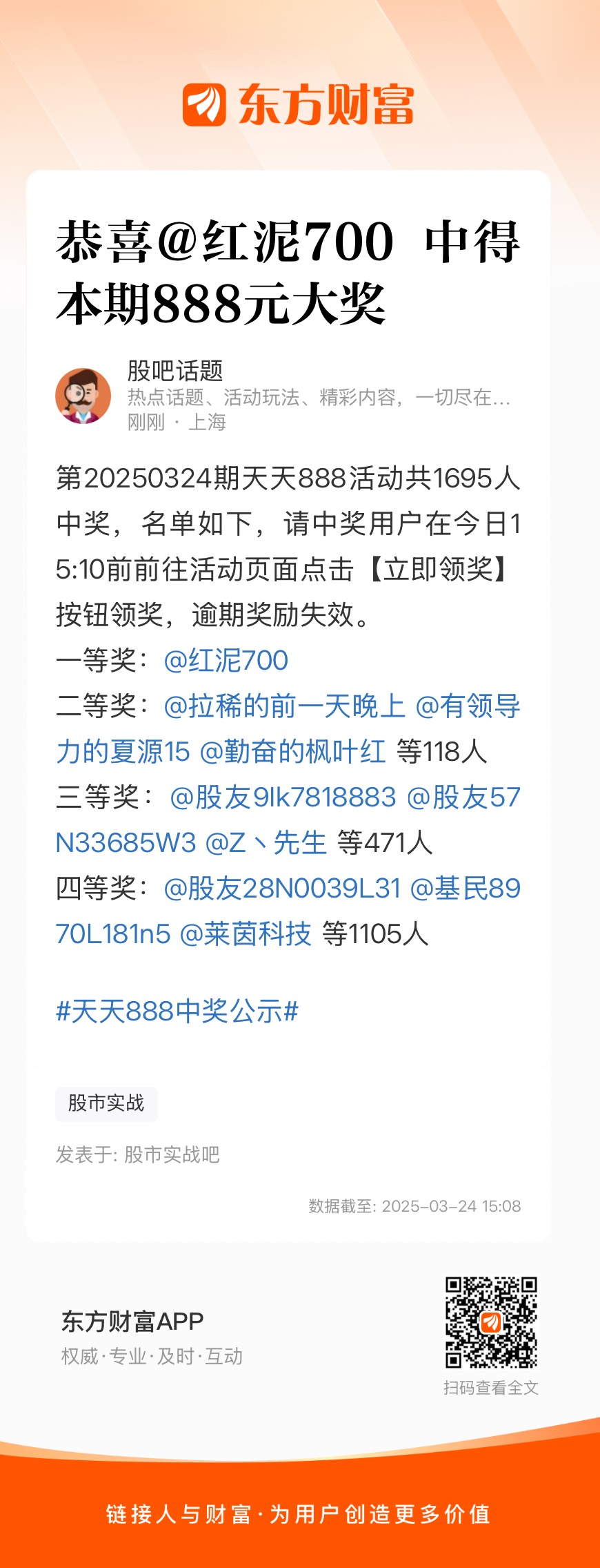 第20250324期天天888活动共1695人中奖,名单如下,请中奖用户在今日15:10前前往活动页面点击【立即领奖】按钮领奖,逾期奖励失效。