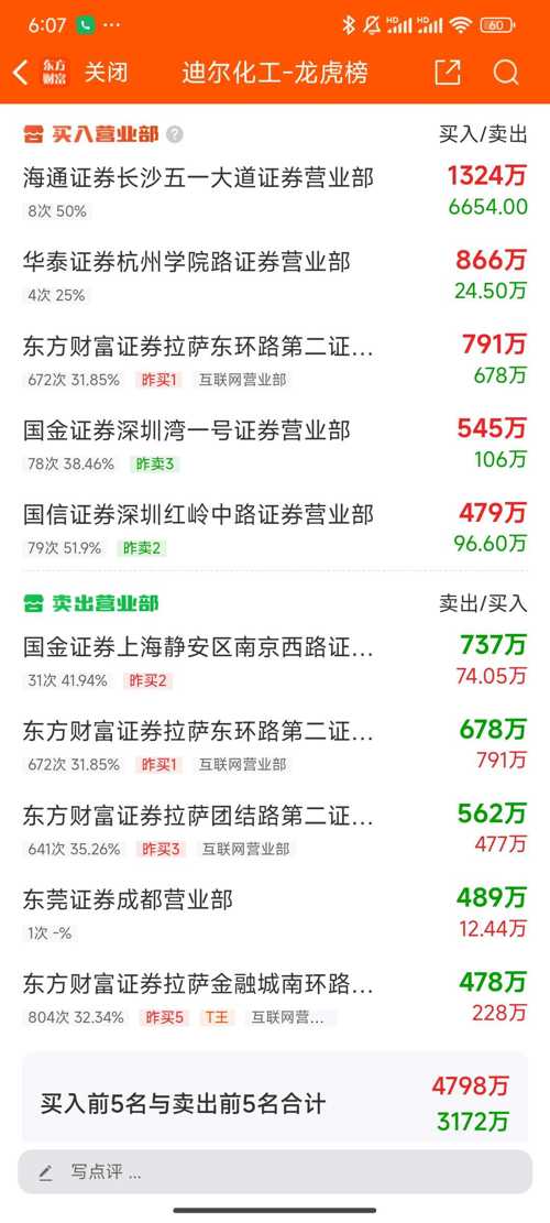 交易所2025年3月28日公布的交易公开信息显示,迪尔化工因成为当日换手率达到20%的前5只股票上榜。迪尔化工当日收报15.6元,涨跌幅-15.68%,偏离值35.22%,换手率35.22%,成交额4.59亿。