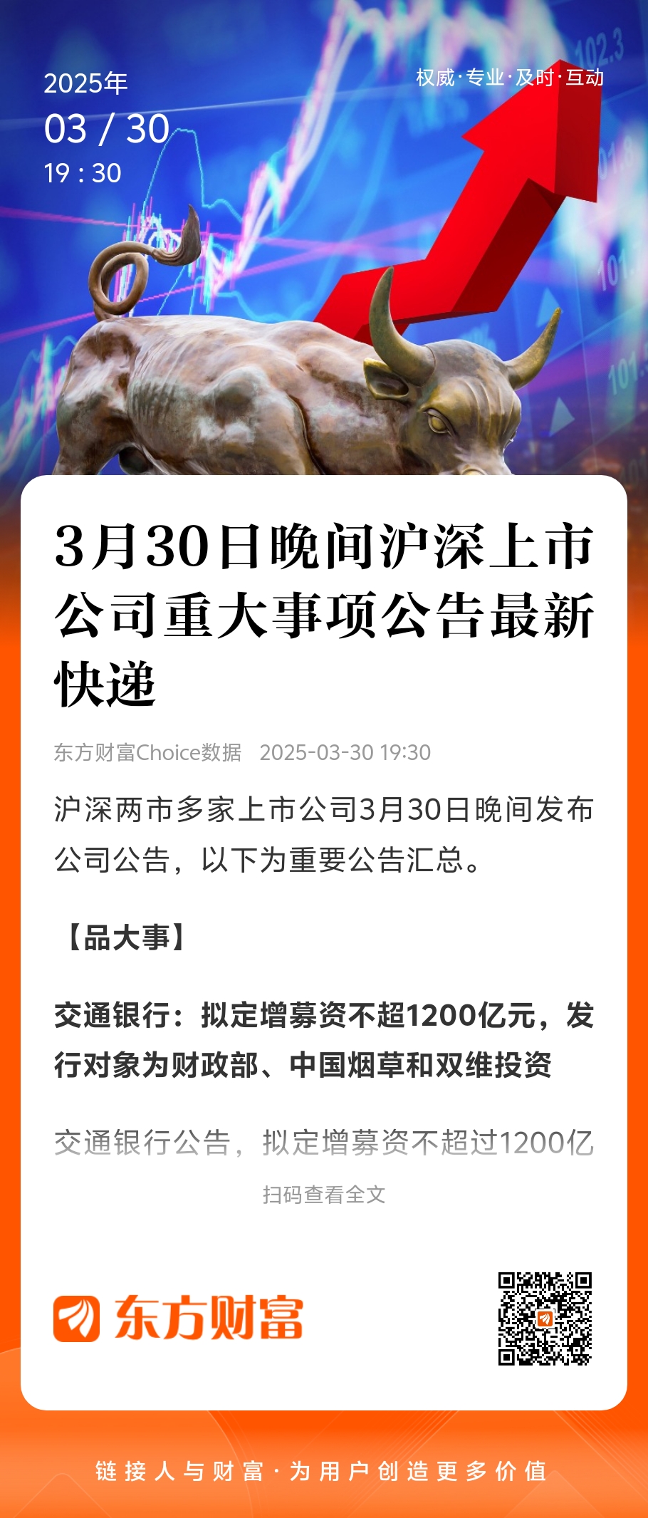 沪深两市多家上市公司3月30日晚间发布公司公告,以下为重要公告汇总。