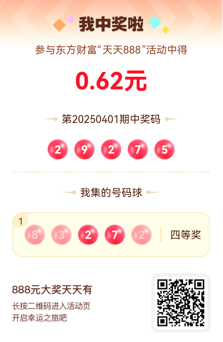 好运来敲门!我在东方财富“天天888”抽奖活动中抽中0.62元红包!快来参与,下一个幸运星可能就是你!