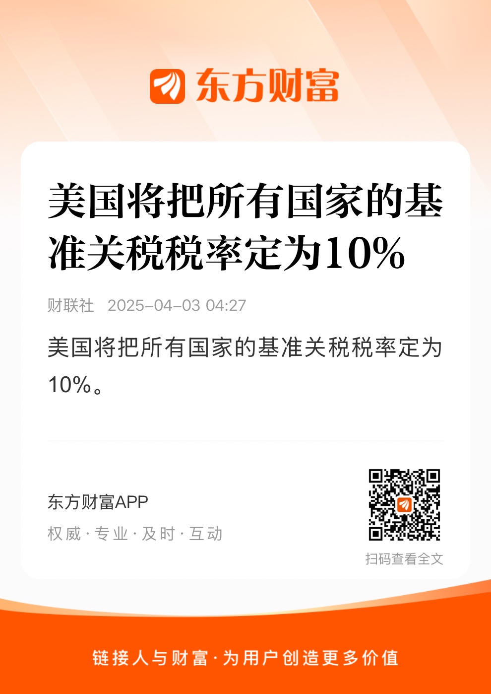美国将把所有国家的基准关税税率定为10%。