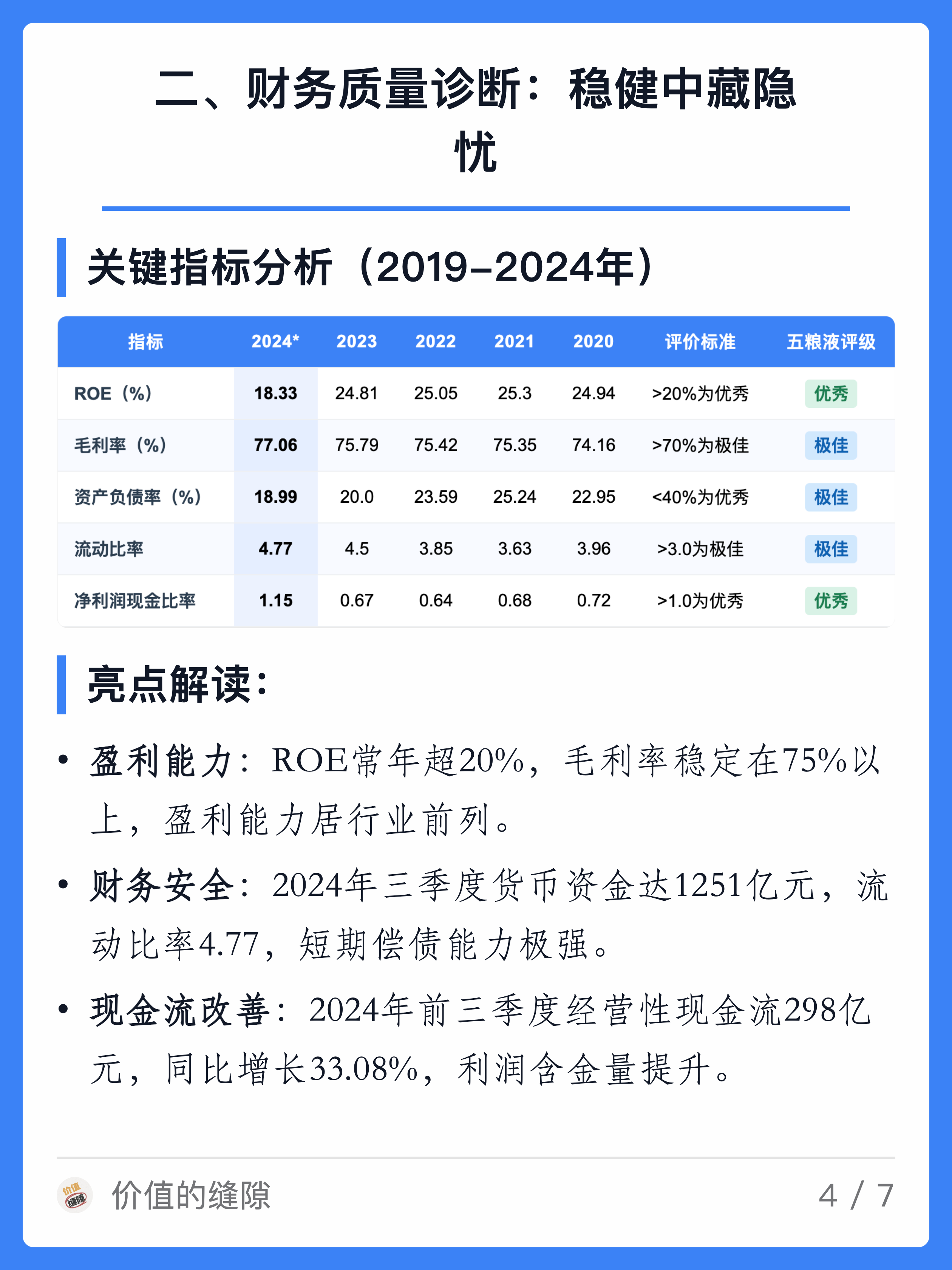毛利率稳定在77%以上,资产负债率仅18.99%,经营性现金流连续5年为正,2024年前三季度达297.94亿元,同比增长33.08%29。