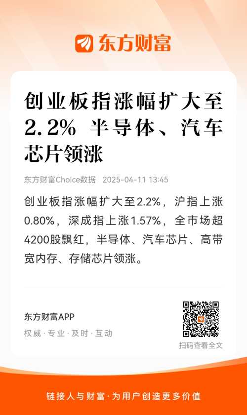 创业板指涨幅扩大至2.2%,沪指上涨0.80%,深成指上涨1.57%,全市场超4200股飘红,半导体、汽车芯片、高带宽内存、存储芯片领涨。