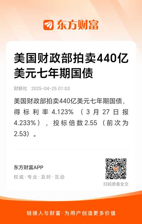 美国财政部拍卖440亿美元七年期国债,得标利率4.123%(3月27日报4.233%),投标倍数2.55(前次为2.53)。