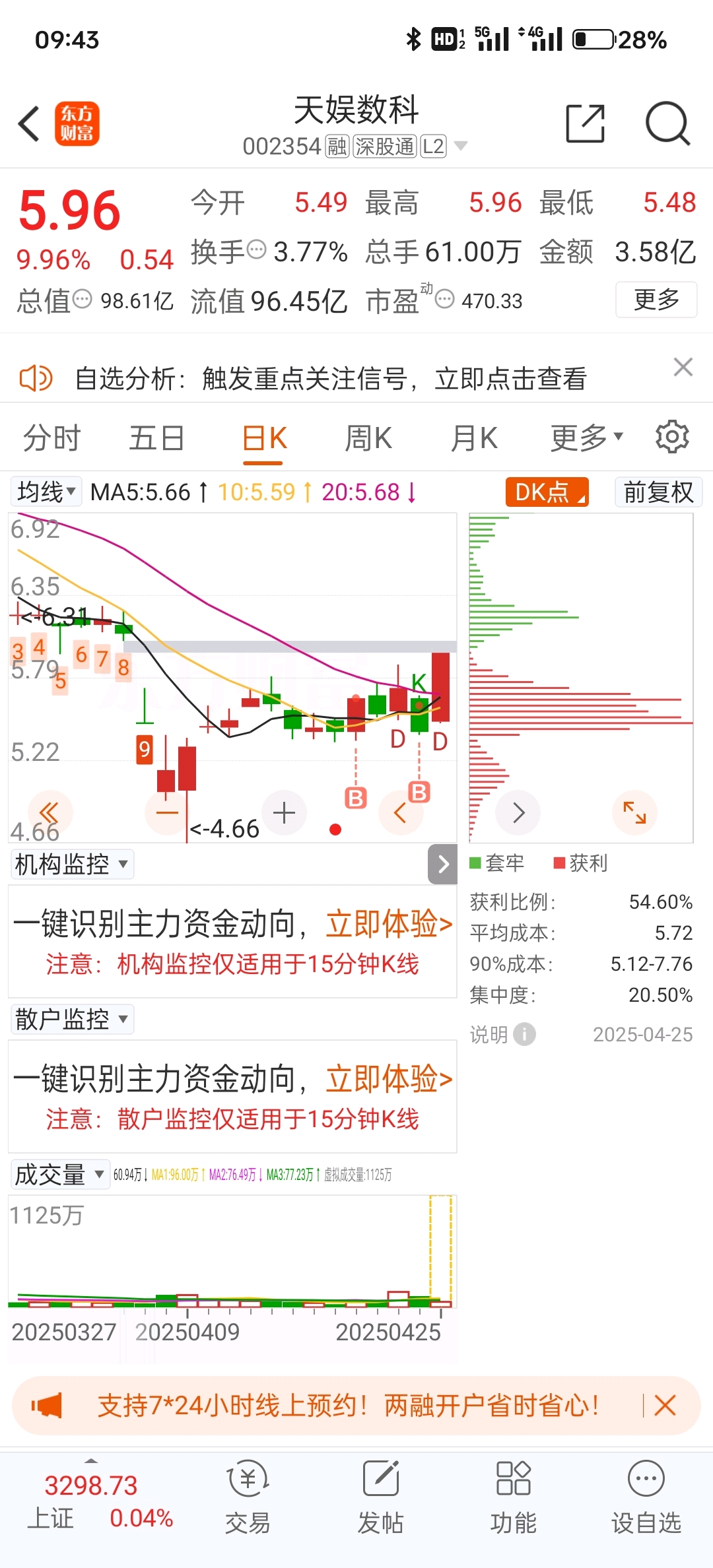 最近是真难做,抓住的为数不多的一个,昨天开盘盯着国芳跟双成,虽然知道一定会涨,但是不敢买,今天不好出来,最后还是加仓了天娱