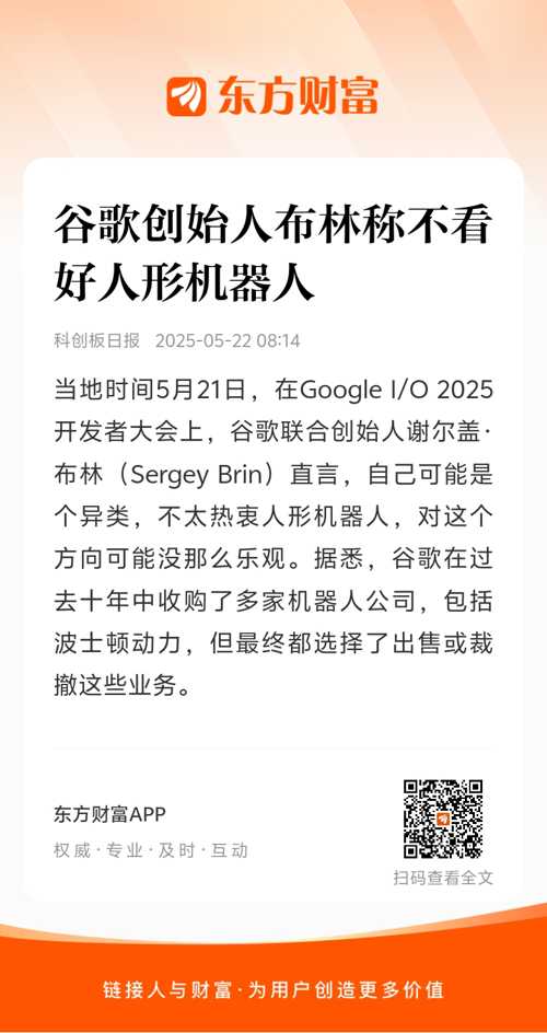 当地时间5月21日,在Google I/O 2025开发者大会上,谷歌联合创始人谢尔盖·布林(Sergey Brin)直言,自己可能是个异类,不太热衷人形机器人,对这个方向可能没那么乐观。据悉,谷歌在过去十年中收购了多家机器人公司,包括波士顿动力,但最终都选择了出售或裁撤这些业务。
