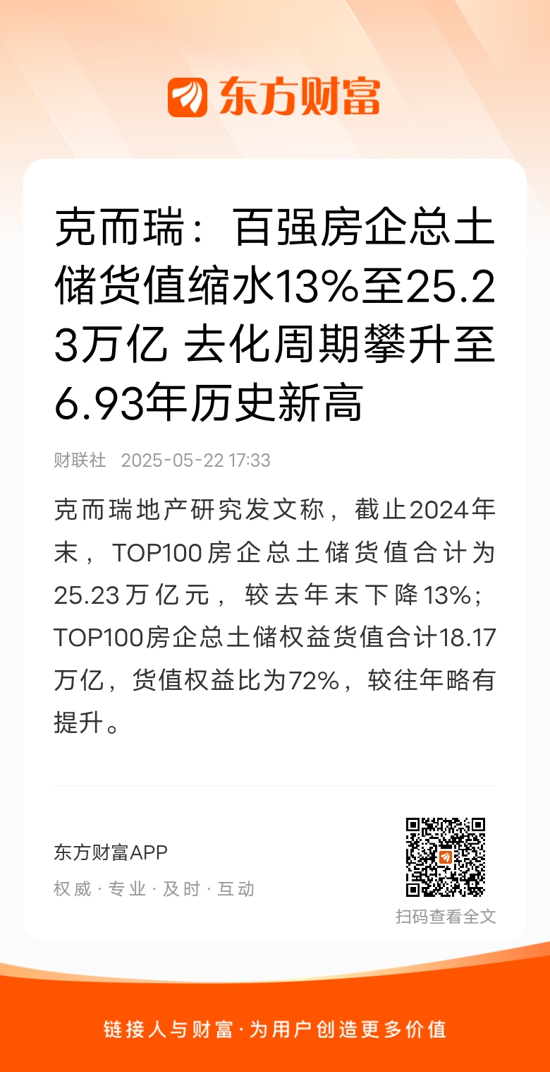 克而瑞地产研究发文称,截止2024年末,TOP100房企总土储货值合计为25.23万亿元,较去年末下降13%;TOP100房企总土储权益货值合计18.17万亿,货值权益比为72%,较往年略有提升。根据TOP100房企总土储货值榜,百强房企截止2024年末的土储货值去化周期加权值为6.93年,为历史新高,这主要是由于不少出险房企的销售腰斩,导致整体去化周期快速上升。