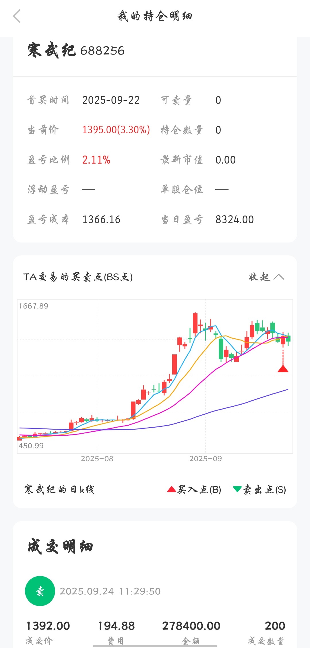 买入寒武纪持仓2天后就给卖出了,胆小的风险试探者