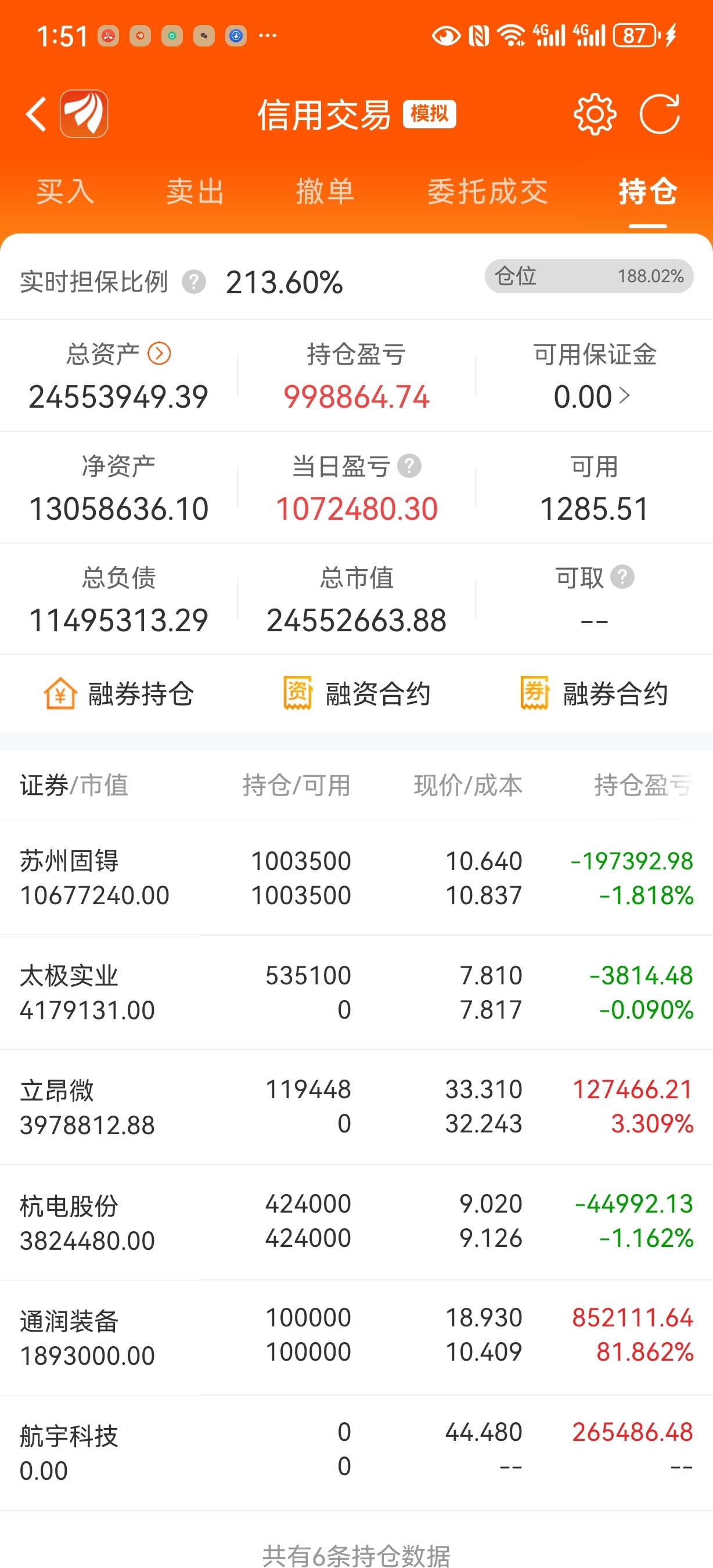 饿死胆小的,撑死胆大的,不要怕向前冲,底限是做好止损位。不管盈亏,一旦走弱,坚决卖出!两个交易日终于满血复活!!#融资融券模拟交易讨论区#