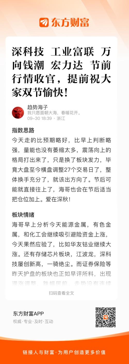 今天走的比预期略好,比早上判断略强,量能也没有萎缩太多,震荡向上的格局打出来了,只是换了板块发力,毕竟大盘至今横盘调整27个交易日了,整体换手充分了,就该出方向了。节后可能就直接往上了,海哥也会在节后适当把仓位加上。爱在深秋!