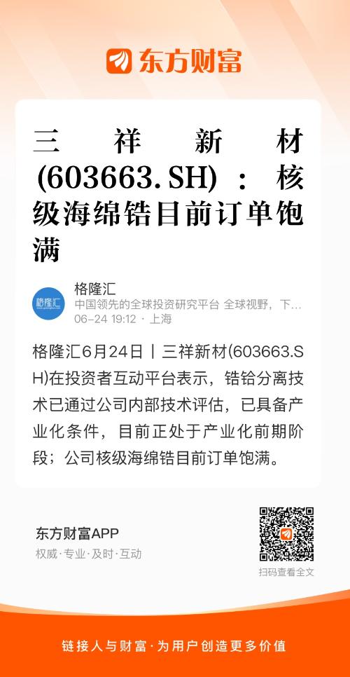 格隆汇6月24日丨三祥新材(603663.SH)在投资者互动平台表示,锆铪分离技术已通过公司内部技术评估,已具备产业化条件,目前正处于产业化前期阶段;公司核级海绵锆目前订单饱满。