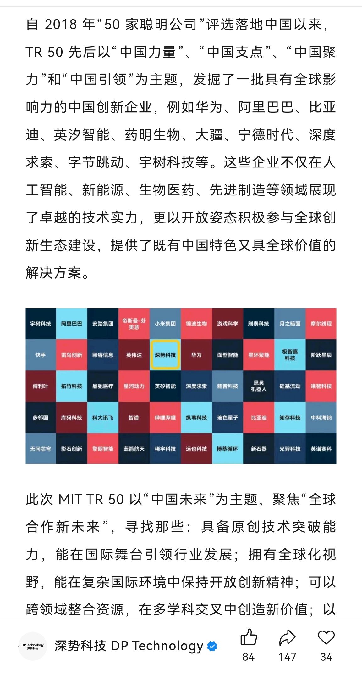 今年入选的企业名单为:宇树科技、阿里巴巴、安踏集团、帝斯曼-芬美意、小米集团、锦波生物、游戏科学、剂泰科技、月之暗面、摩尔线程、快手、雷鸟创新、赜睿信息、英伟达、深势科技、华为、面壁智能、星环聚能、极智嘉科技、阶跃星辰、傅利叶、拓竹科技、品驰医疗、星河动力、英矽智能、深度求索、韶音科技、思灵机器人、硅基流动、曦智科技、多邻国、库犸科技、科大讯飞、智谱、哔哩哔哩、纵苇科技、玻色量子、比亚迪、知存科技、中科海钠、无问芯穹、影石创新、擎朗智能、蓝箭航天、稀宇科技、远也科技、博萃循环、新石器、光羿科技、英诺赛科。