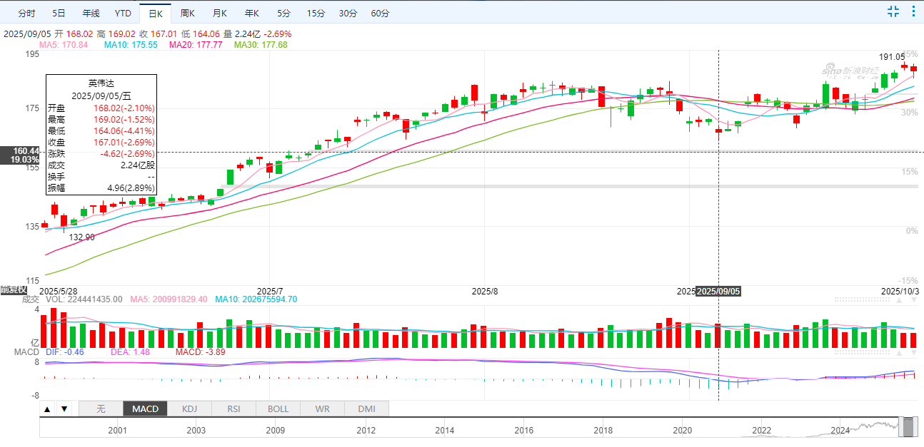 2、英伟达在9月5日下探最低点164.06之后,就走出新的一个上升小浪,直至不断新高。10月2日创下最高191.05,此刻市值为46425亿美元。
