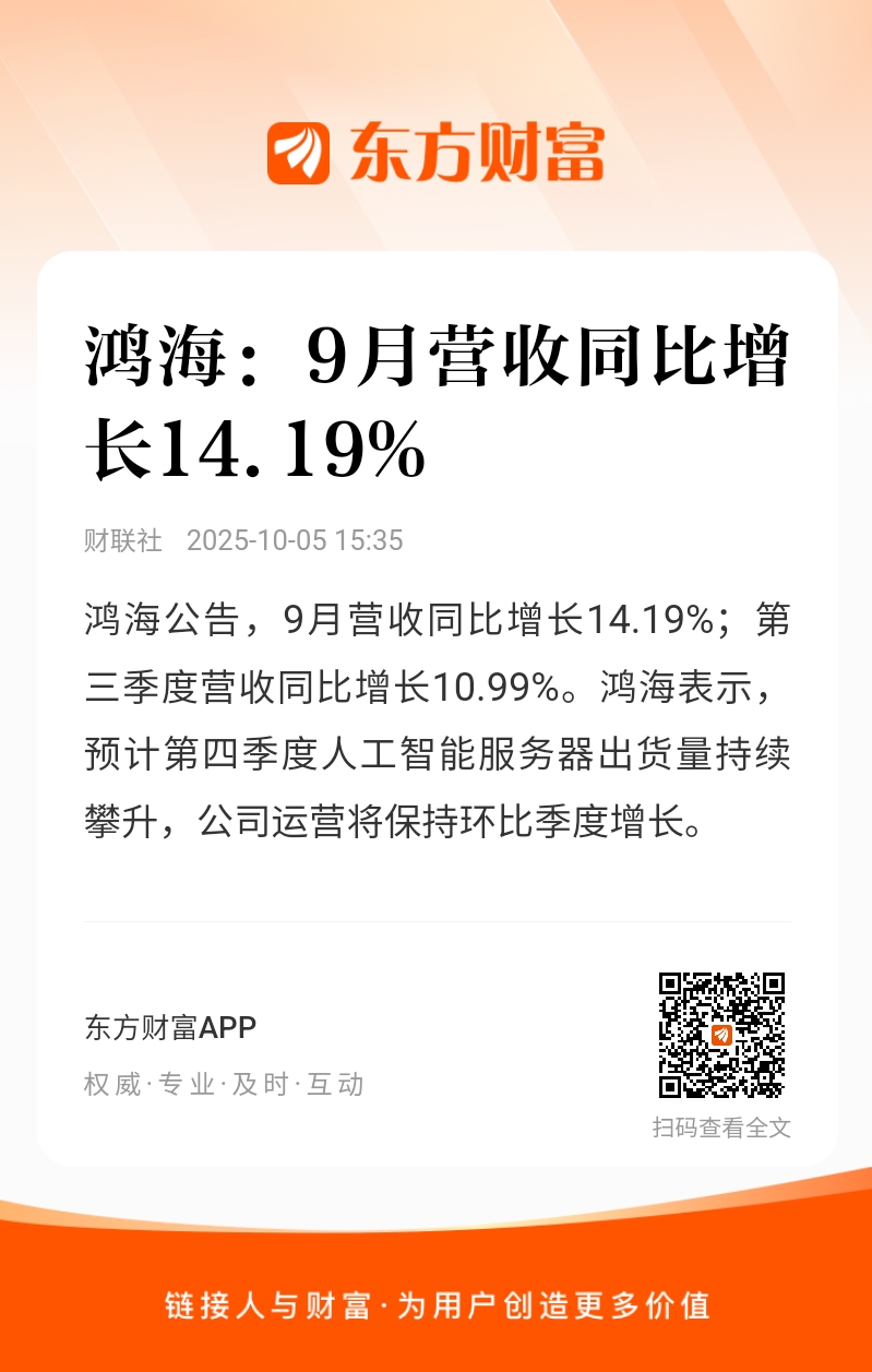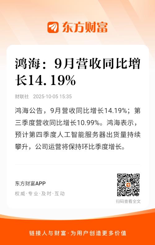 鸿海公告,9月营收同比增长14.19%;第三季度营收同比增长10.99%。鸿海表示,预计第四季度人工智能服务器出货量持续攀升,公司运营将保持环比季度增长。