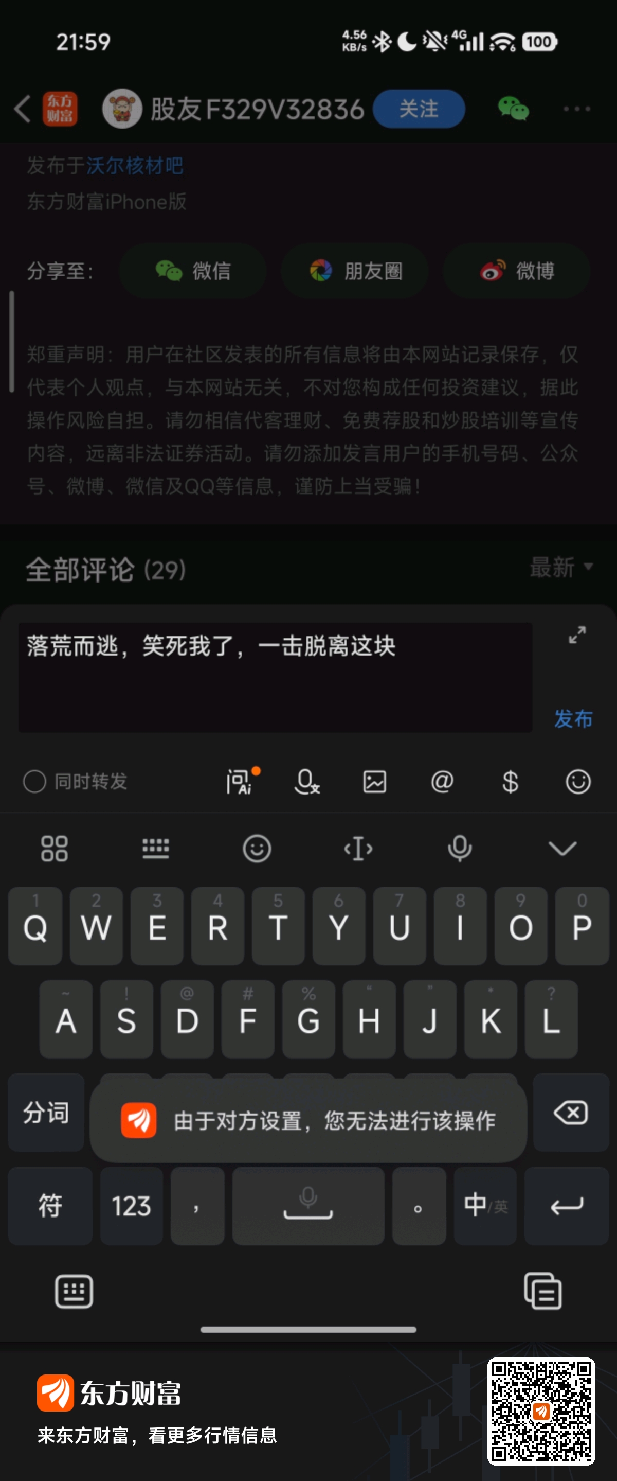 温馨提示: 1.根据《证券法》规定,禁止编造、传播虚假信息或者误导性信息,扰乱证券市场;2.用户在本社区发表的所有资料、言论等仅代表个人观点,与本网站立场无关,不对您构成任何投资建议。用户应基于自己的独立判断,自行决定证券投资并承担相应风险。《东方财富社区管理规定》