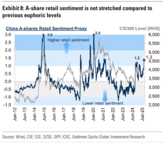 现在A股是不是热过头了?高盛给出了个A股散户情绪指标,认为现在这个指标是1.3,