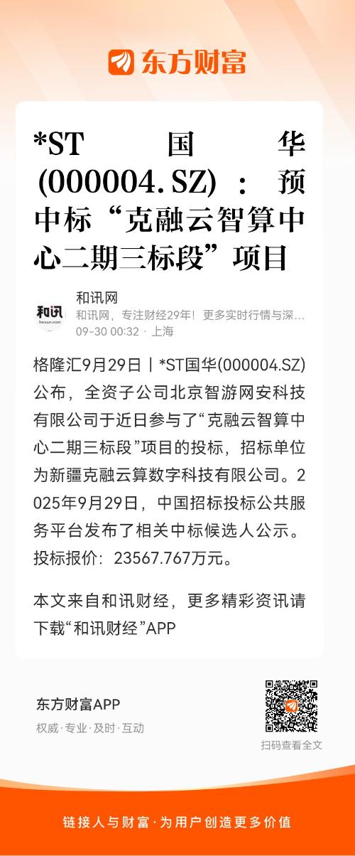 格隆汇9月29日丨*ST国华(000004.SZ)公布,全资子公司北京智游网安科技有限公司于近日参与了“克融云智算中心二期三标段”项目的投标,招标单位为新疆克融云算数字科技有限公司。2025年9月29日,中国招标投标公共服务平台发布了相关中标候选人公示。投标报价:23567.767万元。