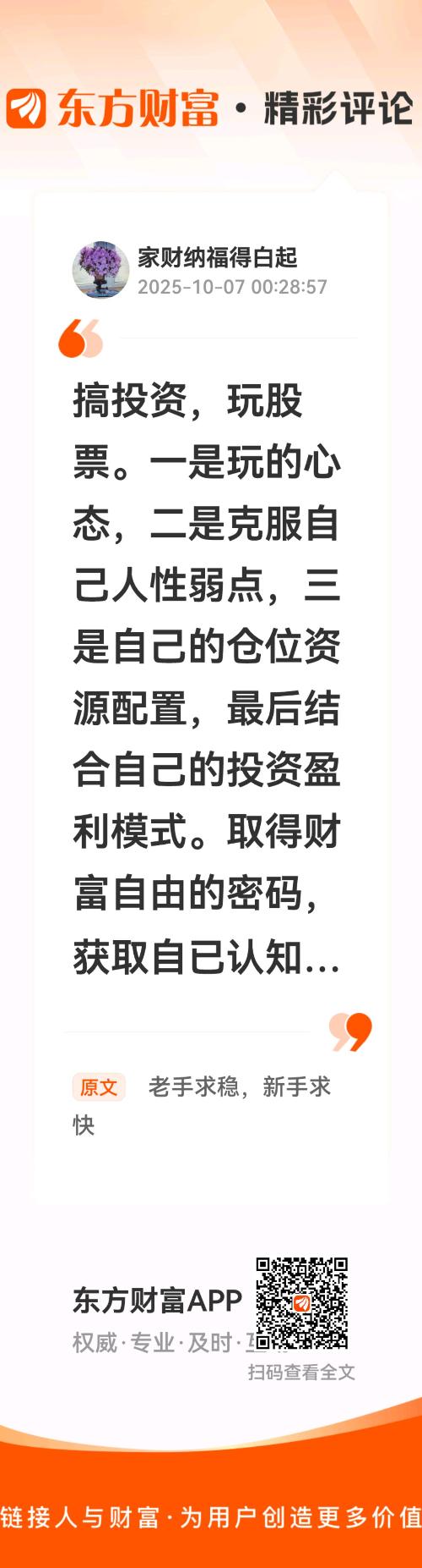 //@家财纳福得白起 :搞投资,玩股票。一是玩的心态,二是克服自己人性弱点,三是自己的仓位资源配置,最后结合自己的投资盈利模式。取得财富自由的密码,获取自已认知内的投资收益,才是市场的高手,说的容易做起来难呀,读懂贪婪与恐惧的真实含义,才是根本。